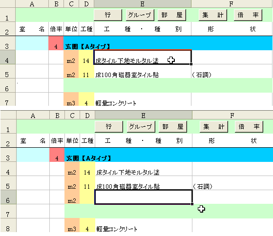 (1)基本的にE列、F列の工種・種別欄と、形状欄は後のシートにある見積書に反映される項目です。この項目が複数ある場合、行を増やす必要があります。