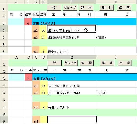 図のようにアクティブセルの背景が白色または緑色にある場所(B~D列は色付きでもよい)、つまり一つの部屋でグループボタンを押します。列位置はどの場所で押しても動作します。ボタンを押すと一つの部屋の最終行で一グループ増えます。【グループ:緑色と緑色で囲まれた範囲】