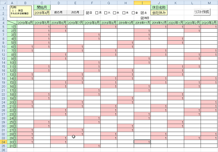 チェックすれば休み扱いになり、その日付の所に数字の「1」が入ります。