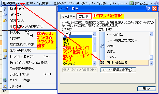 3)ユーザー設定ダイアログの「コマンド」で「分類」、「コマンド」で表示したいコマンドを取得されたメニューの所にドラッグアンドドロップ